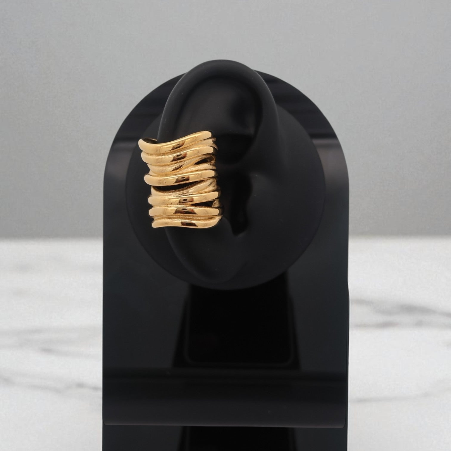 If you've been looking for a bold ear cuff, look no further! This cuff, made of 18-k gold plated stainless steel adds boldness without the weight of most large pieces. It features a striking threaded design and are sure to be a conversation starter.