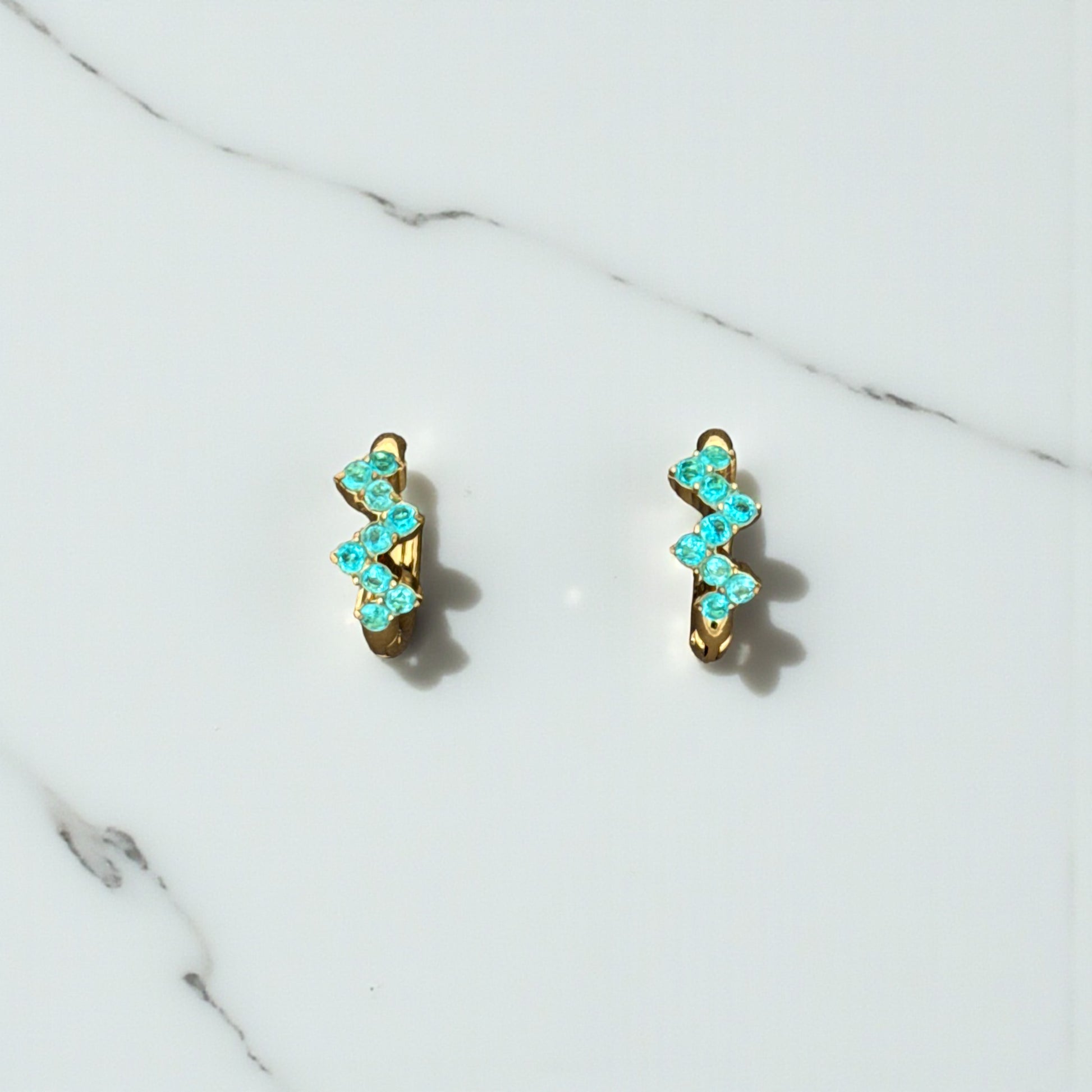 Elevate your style with these chic gold hoop earrings. Embellished with a constellation of teal cabochons, these earrings offer a delightful splash of colour. The photos illustrate the depth of colour, appearing darker and lighter depending on the light that hits it.