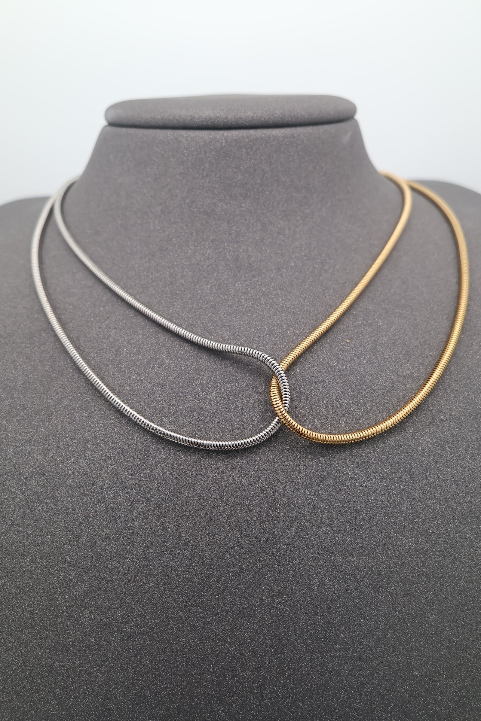 The Natalie is a statement of contrast and connection — gold meets silver in perfect harmony. The necklace features two sleek snake chains gracefully intertwined at the centre. The beauty of the Natalie necklace is that it doesn't make you choose between gold or silver - now you can have it all. And the best part? It goes with literally everything.